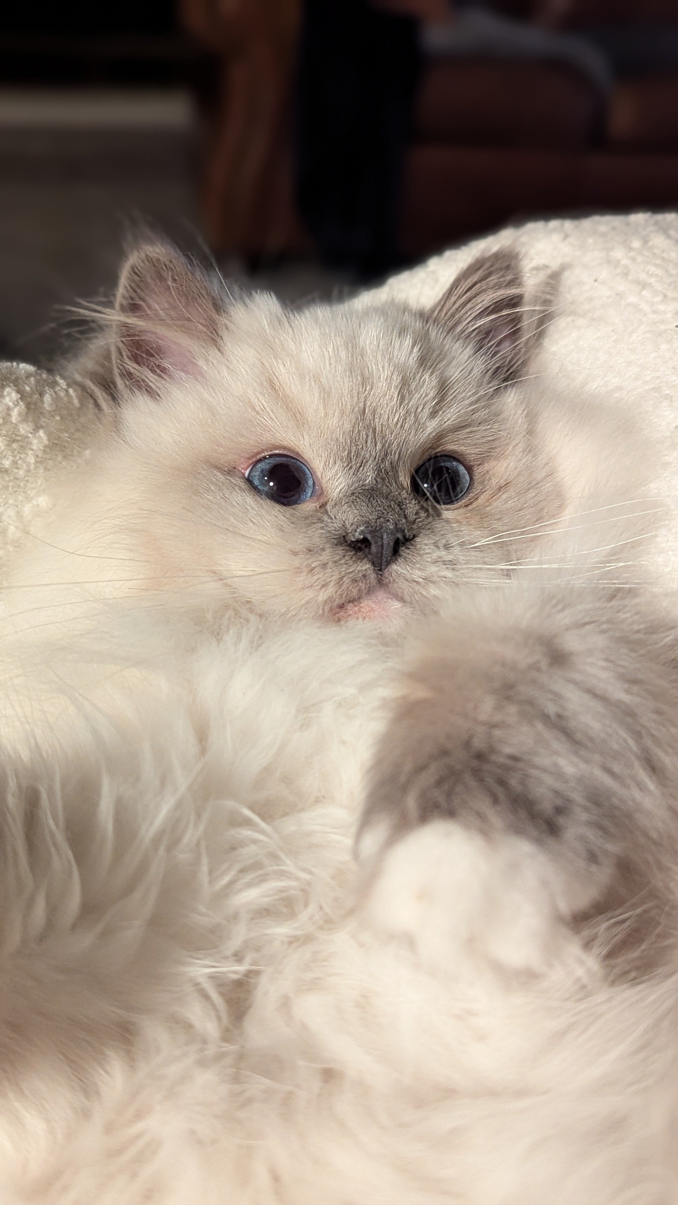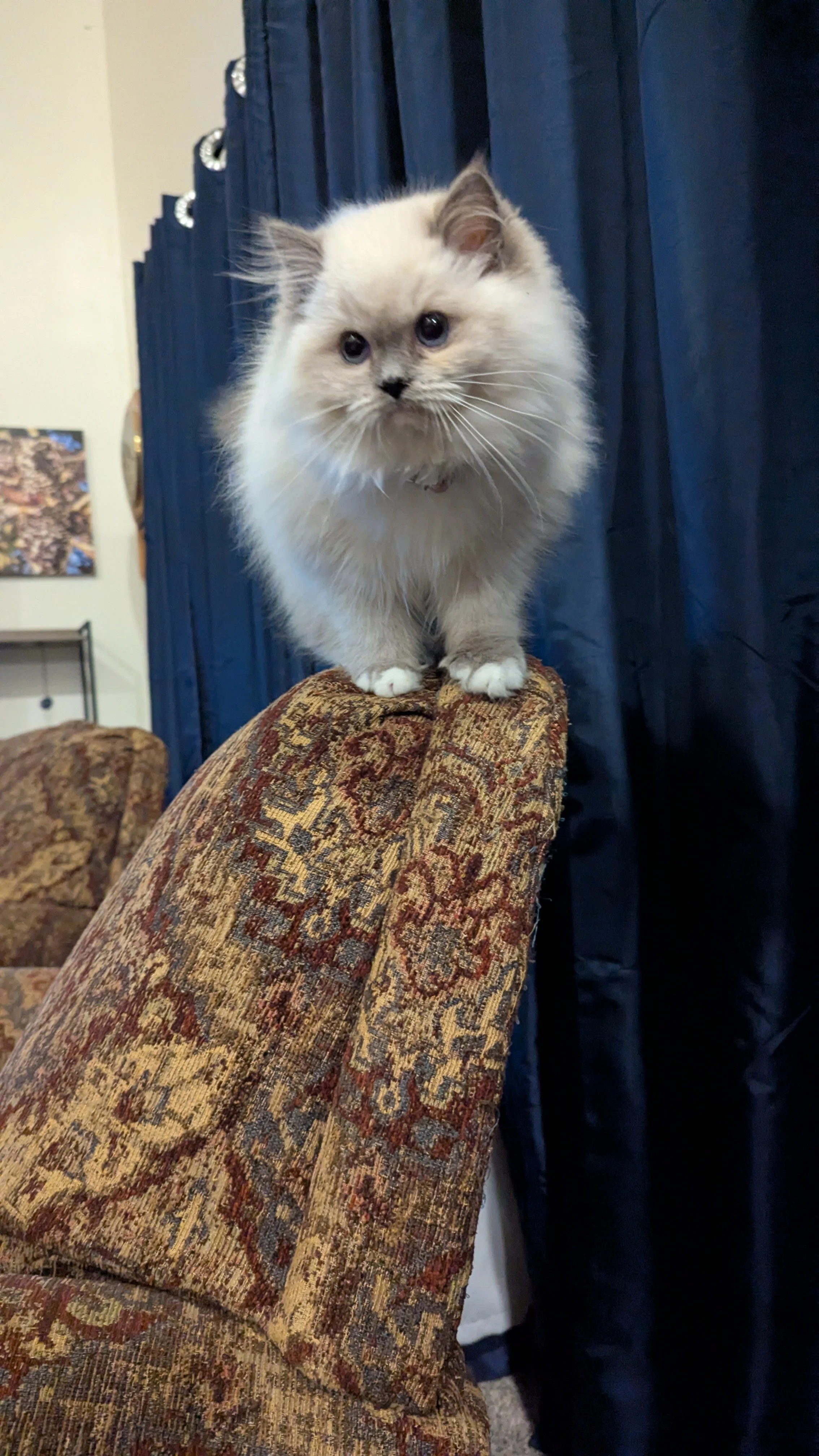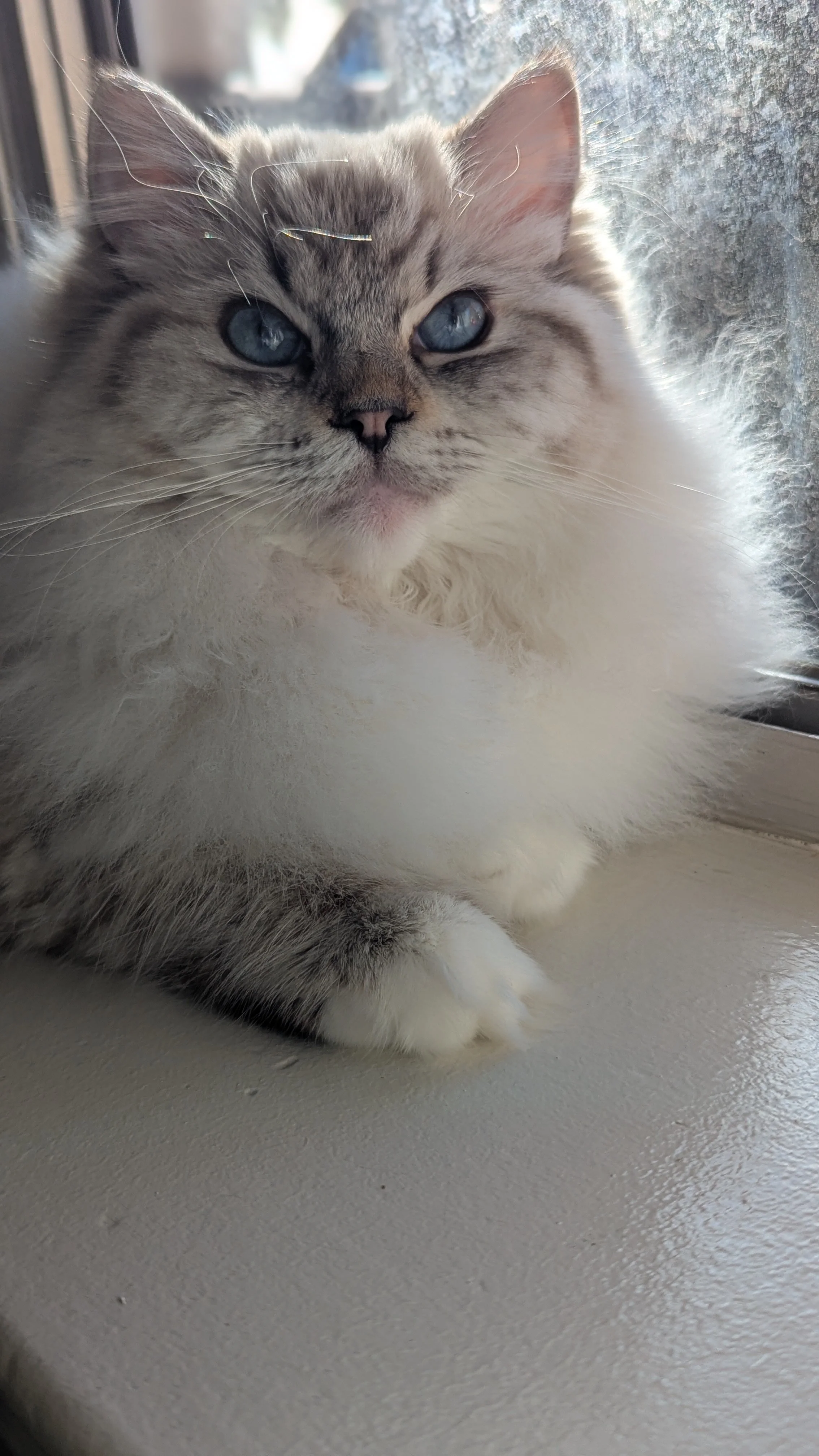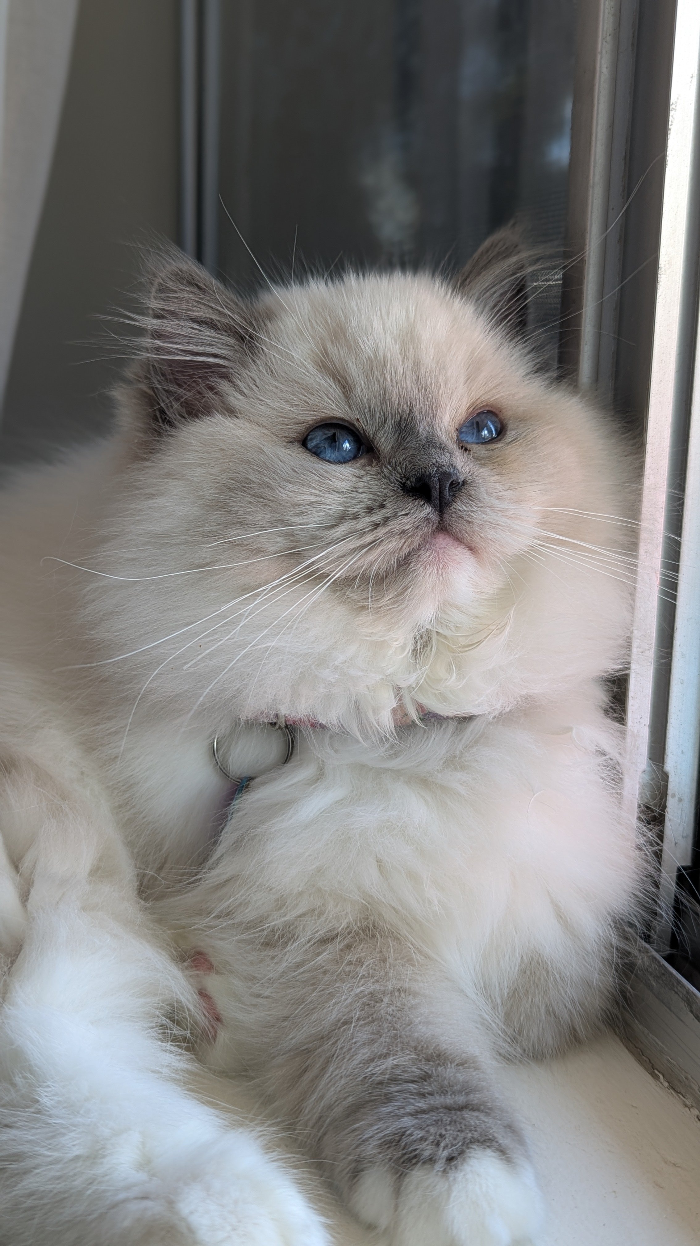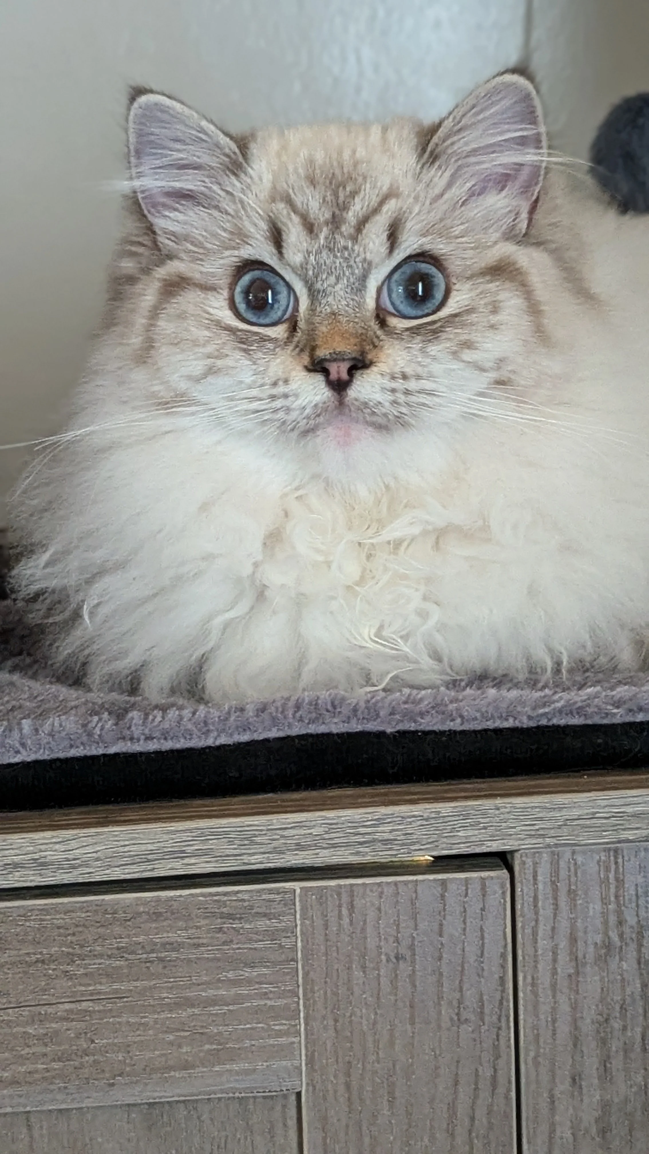 Willamina is our newest addition. She is a blue point mitted. She gives us cuteness aggression when we look at her gorgeous face! We just want to hug her, hold her, squeeze her, but she will have nothing to do with that! She has mischief to get into. She is curious and such an adventurer. She has an independent streak to her which can be a relief at times. She can self-entertain and make a game of anything. She had a heat cycle at 4 months! She is raring to go. She lives life in the fast lane. She brings comedy to our lives for sure! She is a little purr box as well and starts her motor instantly when you pick her up. It will be interesting to see her develop over the next few months. We often wonder if she will slow down after motherhood. She has passed all of her health screenings and is under the excellent care of our veterinary team.